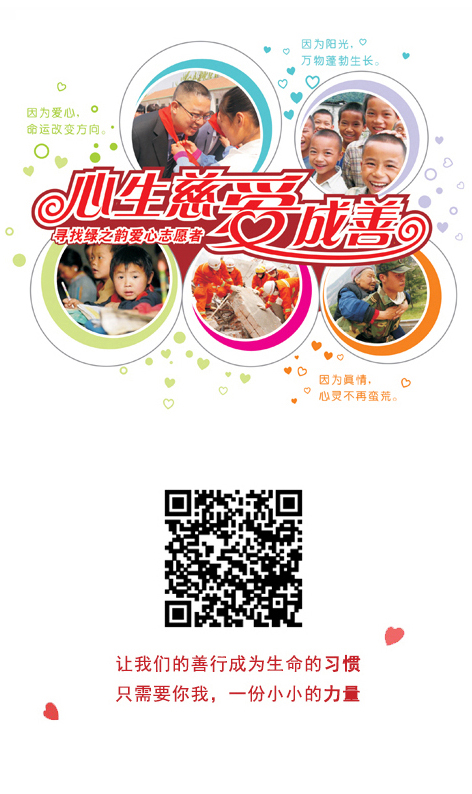 自2012年5月20日起,填寫“綠之韻愛心認(rèn)捐書”參與“每天ー元錢”愛心捐贈(zèng)(大于或等于365元),傳真至公司業(yè)務(wù)服務(wù)部,完成志愿者申請(qǐng),即獲贈(zèng)由公司統(tǒng)一制作的“綠之韻愛心志愿者T恤”及“愛心徽章”。