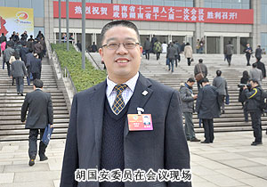 會(huì)議期間,省十一屆政協(xié)委員還集體列席了湖南省第十二屆人民代表大會(huì)第一次會(huì)議,會(huì)議由省委書(shū)記周強(qiáng)支持,省長(zhǎng)徐守盛代表省人民政府作工作報(bào)告。報(bào)告圍繞經(jīng)濟(jì)發(fā)展、兩型社會(huì)建設(shè)、民生事業(yè)改善等內(nèi)容,對(duì)過(guò)去5年進(jìn)行回顧,并就如何推動(dòng)經(jīng)濟(jì)持續(xù)健康發(fā)展、建設(shè)天藍(lán)地綠水凈湖南、為民辦實(shí)事等做出重要部署。此次報(bào)告中有三個(gè)關(guān)鍵點(diǎn):一是加快推進(jìn)新型城鎮(zhèn)化,二是建設(shè)天藍(lán)地綠水凈湖南,三是以創(chuàng)業(yè)帶動(dòng)就業(yè)。值得關(guān)注的是,報(bào)告中提及的這三點(diǎn)與胡國(guó)安委員在擔(dān)任第十屆委員期間提交的提案《關(guān)于全力促進(jìn)我省縣域經(jīng)濟(jì)發(fā)展的建議》和本次提交的兩份提案形成了完美的契合、達(dá)到高度的一致。在擔(dān)任第十屆省政協(xié)委員的五年時(shí)間里,胡國(guó)安委員始終圍繞我省“四化兩型”戰(zhàn)略,圍繞人民群眾最關(guān)心最直接最現(xiàn)實(shí)的利益問(wèn)題積極建言謀策,提交的提案《關(guān)于全力促進(jìn)我省縣域經(jīng)濟(jì)發(fā)展的建議》引起廣泛關(guān)注,被湖南衛(wèi)視、湖南經(jīng)視、《湘聲報(bào)》先后報(bào)道,并被評(píng)為“政協(xié)湖南省第十屆委員會(huì)優(yōu)秀委員”。此次,再次當(dāng)選省十一屆政協(xié)委員,胡國(guó)安委員經(jīng)過(guò)前期充分的考察調(diào)研,向大會(huì)組委會(huì)遞交了兩份提案《加強(qiáng)大氣污染防治工作,優(yōu)化我省環(huán)境質(zhì)量,大力推進(jìn)生態(tài)文明建設(shè)的建議和》、《提升全民創(chuàng)業(yè)質(zhì)量,建設(shè)創(chuàng)業(yè)創(chuàng)新型湖南的建議》,再次受到多家媒體的關(guān)注和與會(huì)委員的廣泛認(rèn)同。提案中,圍繞“生態(tài)湖南、綠色湖南”為出發(fā)點(diǎn),胡國(guó)安委員建議科學(xué)制定城市發(fā)展規(guī)劃,優(yōu)化城市區(qū)域功能和產(chǎn)業(yè)結(jié)構(gòu),著力打造瀏陽(yáng)河生態(tài)風(fēng)光帶,把瀏陽(yáng)河打造成湖南“賽納河”,加快建設(shè)天藍(lán)地綠水凈湖南。在民生事業(yè)改善方面,胡國(guó)安委員深入中小企業(yè)走訪(fǎng)調(diào)查,結(jié)合我省全民創(chuàng)業(yè)現(xiàn)狀,建議創(chuàng)造公平競(jìng)爭(zhēng)的創(chuàng)業(yè)就業(yè)政策環(huán)境,鼓勵(lì)青年自主創(chuàng)業(yè),以創(chuàng)業(yè)帶動(dòng)就業(yè),大力發(fā)展實(shí)體經(jīng)濟(jì),拓寬融資渠道,建立完善的社會(huì)化服務(wù)體系,提高中小企業(yè)市場(chǎng)競(jìng)爭(zhēng)力,全面提升我省全民創(chuàng)業(yè)質(zhì)量,促進(jìn)全省經(jīng)濟(jì)社會(huì)持續(xù)、健康發(fā)展。