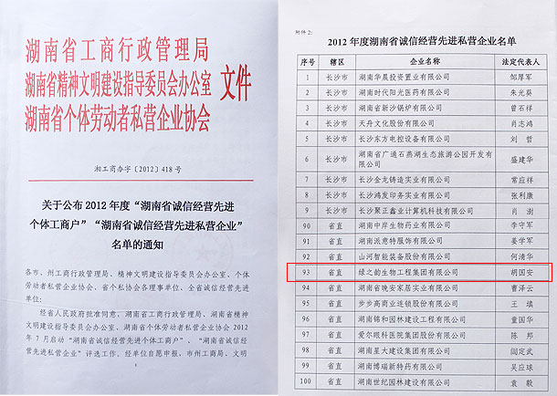 “2012年度全省誠(chéng)信經(jīng)營(yíng)先進(jìn)單位”評(píng)選活動(dòng)自2012年7月活動(dòng)啟動(dòng)以來,綠之韻集團(tuán)高度重視,積極參與年度評(píng)選,經(jīng)省評(píng)選領(lǐng)導(dǎo)小組辦公室嚴(yán)格初審,省評(píng)審委員會(huì)認(rèn)真復(fù)審,媒體公示,并報(bào)經(jīng)湖南省人民政府批準(zhǔn),綠之韻集團(tuán)被光榮授予2012年度“湖南省誠(chéng)信經(jīng)營(yíng)先進(jìn)私營(yíng)企業(yè)”稱號(hào)。綠之韻集團(tuán)董事、常務(wù)副總裁勞嘉表示,誠(chéng)信就是競(jìng)爭(zhēng)力、誠(chéng)信就是市場(chǎng),誠(chéng)信就是財(cái)富。誠(chéng)信是立身之本,誠(chéng)信是生產(chǎn)力,不講誠(chéng)信者無足之地。新的一年,將是綠之韻集團(tuán)大踏步的一年,公司將在省委、省政府及各級(jí)主管部門的正確領(lǐng)導(dǎo)下,繼續(xù)打造誠(chéng)信經(jīng)營(yíng)示范性私營(yíng)企業(yè),狠抓管理,依法經(jīng)營(yíng),誠(chéng)實(shí)守信,走好綠路子、做個(gè)好樣子、打造金牌子,并在業(yè)態(tài)調(diào)整、市場(chǎng)規(guī)劃和公益慈善等多個(gè)方面加大力度,真情服務(wù)消費(fèi)者,打造百年基業(yè)!