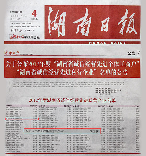 2013年1月4日上午,湖南省工商行政管理局、湖南省精神文明建設(shè)指導(dǎo)委員會(huì)辦公室、湖南省個(gè)體勞動(dòng)者私營(yíng)企業(yè)協(xié)會(huì)聯(lián)合召開新聞通報(bào)會(huì),公布“2012年度湖南省誠(chéng)信經(jīng)營(yíng)先進(jìn)個(gè)體工商戶”和“2012年度湖南省誠(chéng)信經(jīng)營(yíng)先進(jìn)私營(yíng)企業(yè)”名單。湖南省工商局黨組書記、局長(zhǎng)李金冬出席會(huì)議并通報(bào)評(píng)選活動(dòng)開展情況;省文明辦副主任周孟霞宣讀誠(chéng)信經(jīng)營(yíng)先進(jìn)個(gè)體工商戶名單;省工商局總會(huì)計(jì)師、省個(gè)私協(xié)會(huì)常務(wù)副會(huì)長(zhǎng)、評(píng)審委員會(huì)主任張其術(shù)宣讀誠(chéng)信經(jīng)營(yíng)先進(jìn)私營(yíng)企業(yè)名單。會(huì)議由省工商局黨組副書記、副局長(zhǎng)寇勇主持。綠之韻集團(tuán)董事、常務(wù)副總裁勞嘉等先進(jìn)誠(chéng)信經(jīng)營(yíng)單位代表以及省工商局有關(guān)部門負(fù)責(zé)人參加通報(bào)會(huì)。
