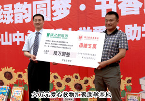 2012年6月25日,綠之韻黑龍江分公司“綠韻圓夢?書香助學(xué)”活動暨綠之韻平山中心小學(xué)愛心助學(xué)基地授牌儀式成功舉行。為了給渴望知識的孩子們創(chuàng)造更好的讀書環(huán)境,活動當(dāng)天,綠之韻黑龍江地區(qū)近100名優(yōu)秀經(jīng)銷商將愛心圖書親手送到了學(xué)生手中,同時,綠之韻集團(tuán)東北區(qū)域業(yè)務(wù)總監(jiān)李定代表綠之韻慈善基金向愛心助學(xué)基地捐贈6萬元款物,標(biāo)志著綠之韻第二家校園愛心“流動圖書館”正式成立。