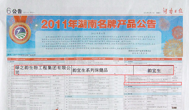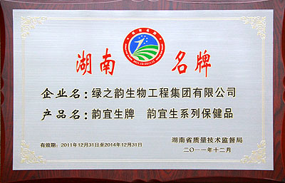 2012年4月10日,長(zhǎng)沙市人民政府質(zhì)量工作會(huì)議成功召開。長(zhǎng)沙市人民政府副市長(zhǎng)何寄華,長(zhǎng)沙市質(zhì)量監(jiān)督局局長(zhǎng)陳曙光、副局長(zhǎng)周笑春出席會(huì)議并發(fā)表重要講話。會(huì)上,綠之韻韻宜生系列產(chǎn)品榮獲“湖南名牌”榮譽(yù)稱號(hào),是繼“韻宜生”商標(biāo)榮獲“湖南省著名商標(biāo)”后的又一重大榮譽(yù)。