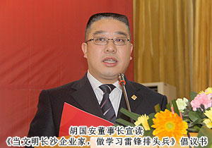 本次會(huì)議中,綠之韻集團(tuán)董事長(zhǎng)胡國(guó)安代表長(zhǎng)沙市工商聯(lián)參會(huì)企業(yè)家向廣大非公經(jīng)濟(jì)人士發(fā)出了《當(dāng)文明長(zhǎng)沙企業(yè)家,做學(xué)習(xí)雷鋒排頭兵》倡議書。積極號(hào)召?gòu)V大民營(yíng)企業(yè)家:學(xué)習(xí)雷鋒理想遠(yuǎn)大、信念堅(jiān)定,做一個(gè)忠誠(chéng)于黨、熱愛人民的人;學(xué)習(xí)雷鋒刻苦鉆研、敬業(yè)奉獻(xiàn),做一個(gè)與時(shí)俱進(jìn)、愛崗敬業(yè)的人;學(xué)習(xí)雷鋒言行一致、誠(chéng)信老實(shí),做一個(gè)誠(chéng)實(shí)守信、求真務(wù)實(shí)的人;學(xué)習(xí)雷鋒勤儉節(jié)約、艱苦奮斗,做一個(gè)艱苦樸素、道德高尚的人。