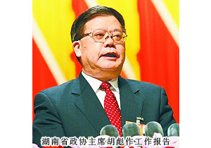 受政協(xié)湖南省第十屆委員會常務(wù)委員會的委托,湖南省政協(xié)主席胡彪向大會作了工作報告。報告從6個方面回顧總結(jié)了一年來我省政協(xié)工作取得的主要成績:認真學(xué)習(xí)貫徹中央和省委重要精神;政治協(xié)商程序化進一步推進;參政議政成效進一步顯現(xiàn);民主監(jiān)督組織化程度進一步提高;愛國統(tǒng)一戰(zhàn)線進一步鞏固;政協(xié)工作科學(xué)化水平進一步提升。