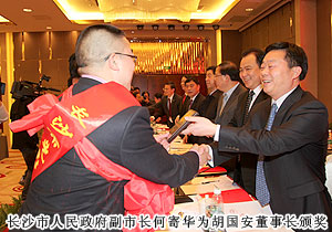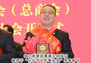 2011年12月23日,長沙市工商聯(lián)(總商會)第十三次會員代表大會在長沙隆重召開。中共湖南省委常委、長沙市委書記陳潤兒,中共長沙市委副書記、市長張劍飛,中共長沙市委常委、市委統(tǒng)戰(zhàn)部部長文樹勛,湖南省委統(tǒng)戰(zhàn)部副部長、省工商聯(lián)黨組書記崔永平等省市各級領導出席會議。作為長沙市工商聯(lián)(總商會)副主席,綠之韻集團董事長胡國安憑借多年來率領企業(yè)積極響應并參與 “萬企聯(lián)村、共同發(fā)展”、情系“三區(qū)”,感恩社會光彩大行動等活動取得的成績,榮獲由長沙市委統(tǒng)戰(zhàn)部、市工商聯(lián)聯(lián)合頒發(fā)的“長沙市光彩事業(yè)獎”。
