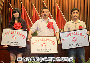 近年來(lái),長(zhǎng)沙市各級(jí)組織和單位緊緊圍繞市委、市政府打造“創(chuàng)業(yè)之都”和創(chuàng)建全國(guó)創(chuàng)業(yè)型城市的總體目標(biāo),以“創(chuàng)業(yè)富民、巾幗示范在行動(dòng)”為載體,積極實(shí)施創(chuàng)業(yè)就業(yè)促進(jìn)行動(dòng),在全市組織開(kāi)展了“巾幗創(chuàng)業(yè)示范基地”、“女大學(xué)生創(chuàng)業(yè)就業(yè)實(shí)踐基地”的評(píng)選活動(dòng)。2011年4月28日,綠之韻集團(tuán)被長(zhǎng)沙市婦女聯(lián)合會(huì)評(píng)選為長(zhǎng)沙市“女大學(xué)生創(chuàng)業(yè)就業(yè)實(shí)踐基地”。中共長(zhǎng)沙市委常委、統(tǒng)戰(zhàn)部長(zhǎng)虢正貴、副市長(zhǎng)何寄華等市級(jí)領(lǐng)導(dǎo)出席本次會(huì)議并頒發(fā)榮譽(yù)牌匾,長(zhǎng)沙市婦聯(lián)黨組書(shū)記、主席譚慧慧作工作報(bào)告。