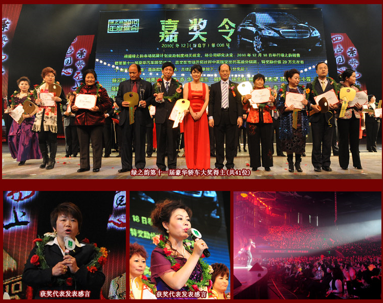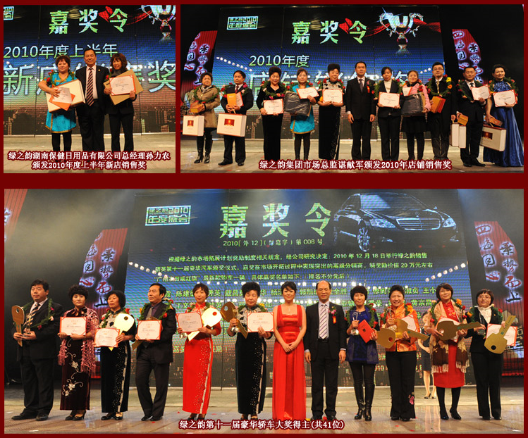 在星光閃耀、榮光無限的年會(huì)頒獎(jiǎng)舞臺(tái),曾經(jīng)含淚播種的英雄,此刻含笑收獲。2010年度星級(jí)鉆石榮譽(yù)徽章大獎(jiǎng)、2010年度豪華轎車大獎(jiǎng)、2010年店鋪銷售獎(jiǎng)、2010年度上半年新店銷售獎(jiǎng),每一項(xiàng)榮譽(yù)都是曾經(jīng)努力奮斗的佐證。他們,在開拓中崛起,在堅(jiān)持中壯大,奔跑的腳步從未停歇,在他們的感言分享中,我們可以見證綠之韻人逐夢的力量,感受夢想實(shí)現(xiàn)的喜悅與感動(dòng)。