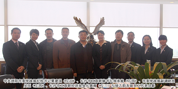2010年12月1日,就綠之韻集團(tuán)董事長胡國安參評“第三屆長沙市優(yōu)秀中國特色社會主義事業(yè)建設(shè)者”評選活動事宜,中共長沙市委統(tǒng)戰(zhàn)部紀(jì)檢書記粟建國、副調(diào)研員吳玨、長沙市工商聯(lián)秘書長周承能、經(jīng)濟(jì)處處長黃羽一行蒞臨綠之韻集團(tuán)實地考察,綠之韻集團(tuán)董事常務(wù)副總裁勞嘉、董事長助理戴曉彥全程陪同。