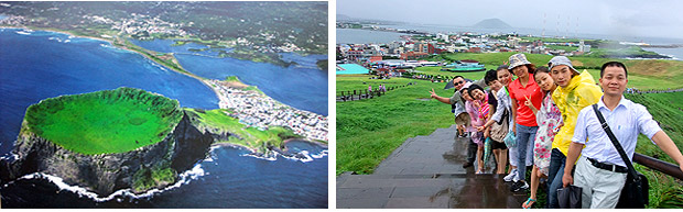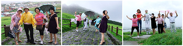 濟(jì)州島是韓國(guó)最美麗的島嶼,韓國(guó)新婚夫妻以及情侶都會(huì)在這里共度浪漫時(shí)光,因此又有著“蜜月之島”和“浪漫之島”的美稱。在這里,伙伴們充份領(lǐng)略了濟(jì)州島的三多:石頭多、風(fēng)多、海產(chǎn)多。讓大家嘖嘖稱奇的是,因?yàn)闆](méi)有小偷與乞丐,在島上的民宅里看不到一扇大門,島上居民民心宛如波光耀的大自然與豐富的果實(shí),純潔美麗?;锇閭儏⒂^了天地淵、2002年世界杯賽事體育場(chǎng)等旅游景點(diǎn),體驗(yàn)濟(jì)州島海水溫泉以及傳統(tǒng)養(yǎng)生汗蒸,穿著韓服學(xué)習(xí)如何制作泡菜,一個(gè)個(gè)樂(lè)不思蜀。濟(jì)州民俗村博物館再現(xiàn)了19世紀(jì)濟(jì)州島的風(fēng)情,在這里可以了解韓國(guó)民族歷史以及生活習(xí)慣同時(shí)也可以選購(gòu)享譽(yù)全球的高麗參,為親朋好友挑選一份合意的禮物。魅力濟(jì)州島以暴雨迎接了前來(lái)參觀的伙伴,但也充分展現(xiàn)了它的熱情與魅力,大家的游興絲毫沒(méi)有受到影響反而多出一種“欲與天公試比高”的豪情。