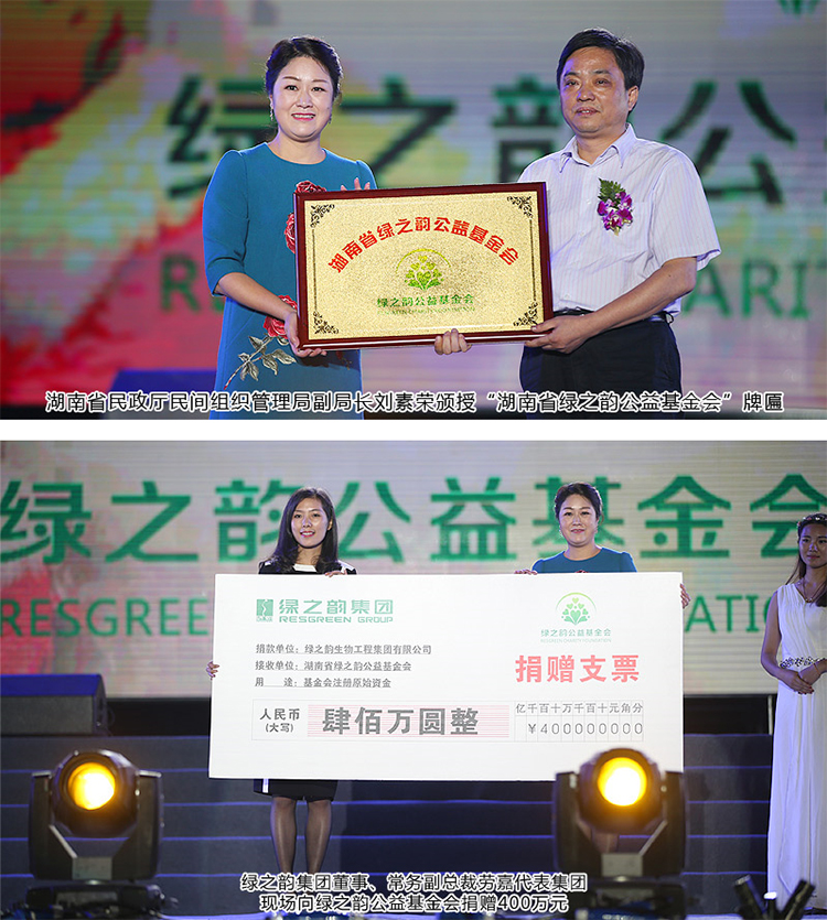 年會(huì)慶典現(xiàn)場(chǎng),綠之韻公益基金會(huì)隆重舉行授牌儀式,湖南省民政廳民間組織管理局副局長(zhǎng)劉素榮將“湖南省綠之韻公益基金會(huì)”牌匾頒授給綠之韻集團(tuán)董事、常務(wù)副總裁勞嘉;董事、常務(wù)副總裁勞嘉代表集團(tuán)現(xiàn)場(chǎng)向綠之韻公益基金會(huì)捐贈(zèng)400萬(wàn)元,用于公益慈善救助行動(dòng)。湖南省民政廳民間組織管理局副局長(zhǎng)劉素榮向胡國(guó)安董事長(zhǎng)及全體員工致以深深的謝意,向綠之韻公益基金會(huì)的授牌正式成立表示熱烈祝賀。他表示,綠之韻集團(tuán)在取得良好經(jīng)濟(jì)效益的同時(shí),始終致力于慈善公益事業(yè),廣施善緣,扶危濟(jì)困,在社會(huì)上起到了很好的示范帶頭作用,不愧是民族企業(yè)的標(biāo)桿,其做法值得肯定和贊譽(yù)。
