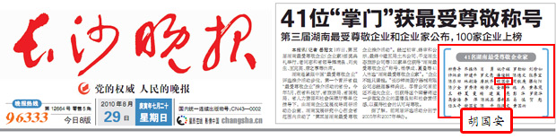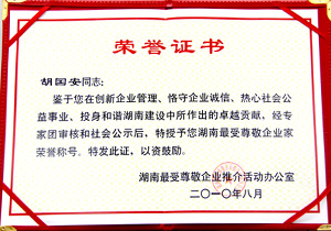 2010年8月28日,由湖南省科技廳、湖南省國(guó)家稅務(wù)局、湖南企業(yè)發(fā)展調(diào)研辦公室、湖南發(fā)展研究中心等單位聯(lián)合舉辦的"第三屆湖南最受尊敬企業(yè)推介"頒獎(jiǎng)盛典暨新聞通報(bào)會(huì)在湖南蓉園賓館舉行。湖南省人大常委會(huì)黨組成員、省政府顧問(wèn)唐之享、原湖南省委書(shū)記熊清泉、原湖南省政協(xié)主席劉夫生等老領(lǐng)導(dǎo)出席本次頒獎(jiǎng)活動(dòng)?!逗先?qǐng)?bào)》、《瀟湘晨報(bào)》、紅網(wǎng)、長(zhǎng)沙新聞?lì)l道等多家媒體對(duì)本次評(píng)選給予高度關(guān)注。綠之韻集團(tuán)榮獲“湖南最受尊敬企業(yè)”榮譽(yù)稱號(hào),胡國(guó)安董事長(zhǎng)被授予“湖南最受尊敬企業(yè)家”榮譽(yù)稱號(hào)。