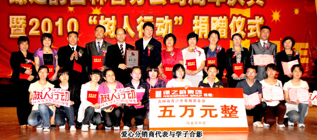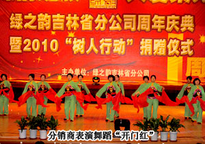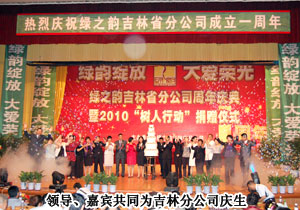 2010年5月29日,綠之韻吉林分公司喜迎“綠韻綻放?大愛榮光”一周年慶典暨“綠之韻樹人行動”捐贈儀式。綠之韻集團執(zhí)行總經理龔振、吉林分公司經理劉曉桅與1000多名分銷精英共同為吉林分公司點亮生日蠟燭,歡樂慶生!同時,吉林省青少年發(fā)展基金會部長王超與東北師范大學10名品學兼優(yōu)的貧困學子列席會議,接受吉林分公司10名愛心分銷商5萬元人民幣的愛心捐贈。