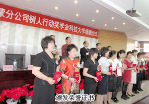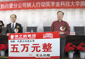 2010年5月24日,內(nèi)蒙古科技大學(xué)禮堂內(nèi)座無虛席,由綠之韻慈善基金聯(lián)合內(nèi)蒙古青少年基金會、內(nèi)蒙古科技大學(xué)主辦的“綠之韻樹人行動”捐贈儀式隆重舉行。這是綠之韻內(nèi)蒙古分公司成立一周年以來,第二次在內(nèi)蒙古地區(qū)開展“綠之韻樹人行動”,以資助更多的貧困大學(xué)生完成學(xué)業(yè)。綠之韻集團(tuán)執(zhí)行總經(jīng)理龔振、內(nèi)蒙古分公司經(jīng)理侯立新、內(nèi)蒙古科技大學(xué)學(xué)工部部長王軍、綠之韻集團(tuán)內(nèi)蒙古地區(qū)領(lǐng)導(dǎo)人王連坤、郝建兵等愛心精英代表、以及內(nèi)蒙古科技大學(xué)“綠之韻樹人行動”獎學(xué)金獲得者齊聚一堂,共同見證“綠之韻樹人行動”在內(nèi)蒙古科技大學(xué)再啟愛心接力。