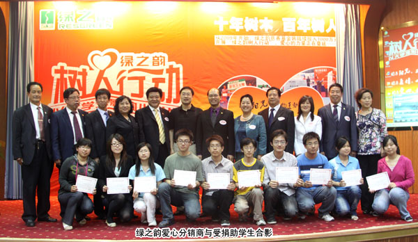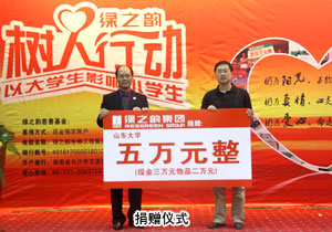 一年之計(jì),莫如樹谷;十年之計(jì),莫如樹木;終身之計(jì),莫如樹人。2010年5月13日,“綠之韻樹人行動”全國第四站走進(jìn)山東大學(xué),現(xiàn)場舉行捐贈儀式,資助10名品學(xué)兼優(yōu)的貧困學(xué)生。綠之韻集團(tuán)執(zhí)行總經(jīng)理龔振出席會議,代表綠之韻慈善基金向貧困學(xué)子首批捐助50000元愛心善款,山東大學(xué)黨委學(xué)生工作部部長曲明軍、副部長陳鑫代表校方接受捐贈。教育界、新聞界、文化界的相關(guān)領(lǐng)導(dǎo)與兩百余名大學(xué)生見證了綠之韻人又一次善舉。