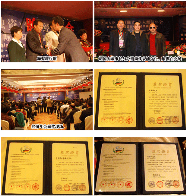 綠之韻集團胡國安董事長受邀全程出席此次會議,綠之韻集團榮獲“世界華人企業(yè)500強”榮譽大獎,胡國安董事長個人被評為“影響中國改革開放30年100位杰出華人企業(yè)家”, 全國工商聯(lián)副主席孫曉華為胡國安董事長頒獎; 綠之韻分銷商管理委員會會長浦守仁獲“2008年世界經(jīng)濟華人十大杰出團隊領(lǐng)導人獎”。