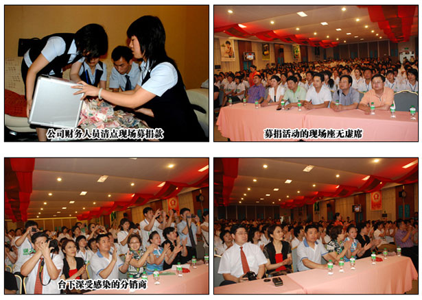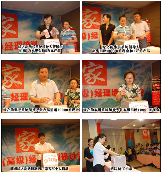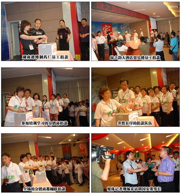 而綠之韻集團(tuán)總部通過共青團(tuán)長沙市委、長沙市青年企業(yè)家協(xié)會的聯(lián)絡(luò)與長沙市青少年發(fā)展基金會、長沙市血液中心組織現(xiàn)場捐款和義務(wù)獻(xiàn)血活動。17日下午13點(diǎn)30分,綠之韻“眾志成城 抗震救災(zāi)”活動在綠之韻集團(tuán)中國總部舉行,共青團(tuán)長沙市委副書記、長沙市青年企業(yè)家協(xié)會常務(wù)副會長彭勇、長沙市青年企業(yè)家協(xié)會秘書長王海軍也蒞臨現(xiàn)場。隨后,由綠之韻集團(tuán)董事長兼總裁胡國安向共青團(tuán)長沙市委捐款100萬元現(xiàn)金及物資,而正在公司參加培訓(xùn)學(xué)習(xí)的200余名分銷商、湖南綠之韻迪博制藥廠員工、綠之韻國際大酒店貴賓樓員工以及公司總部員工井然有序地排隊向?yàn)?zāi)區(qū)捐款,現(xiàn)場募集現(xiàn)金138888元,共青團(tuán)長沙市委當(dāng)即將1138888元現(xiàn)金及物資轉(zhuǎn)交給長沙市青少年發(fā)展基金會。湖南電視臺、長沙電視臺、星辰在線網(wǎng)站等媒體記者對胡國安董事長進(jìn)行了現(xiàn)場采訪,胡總說:“萬涓成水,匯愛成海。在中華民族遭遇災(zāi)難的時刻,只要我們?nèi)f眾一心,眾志成城,共負(fù)國難,共渡難關(guān),我們就一定能贏得抗震救災(zāi)的最后勝利,一定能夠幫助災(zāi)區(qū)人民重建美好的家園!”