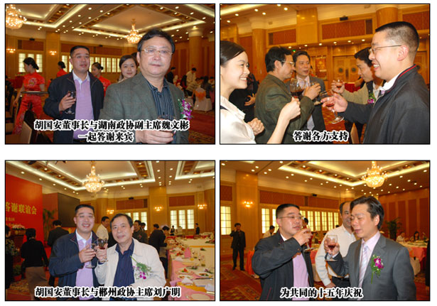 2008年4月21日,由政協(xié)湖南省委主辦的湖南黨政權(quán)威機(jī)關(guān)報(bào)《湘聲報(bào)》更名擴(kuò)版十五周年答謝聯(lián)誼會(huì)在湖南長(zhǎng)沙華天大酒店隆重舉行。湖南政協(xié)副主席陽寶華、湖南政協(xié)副主席、湖南廣播影視集團(tuán)董事長(zhǎng)魏文彬以及各地市政協(xié)領(lǐng)導(dǎo)、社會(huì)各界代表紛紛到場(chǎng)表示祝賀。綠之韻集團(tuán)董事長(zhǎng)兼總裁胡國(guó)安先生作為《湘聲報(bào)》的特別顧問、名譽(yù)主編也應(yīng)邀出席了此次聯(lián)誼會(huì),并發(fā)表重要講話。