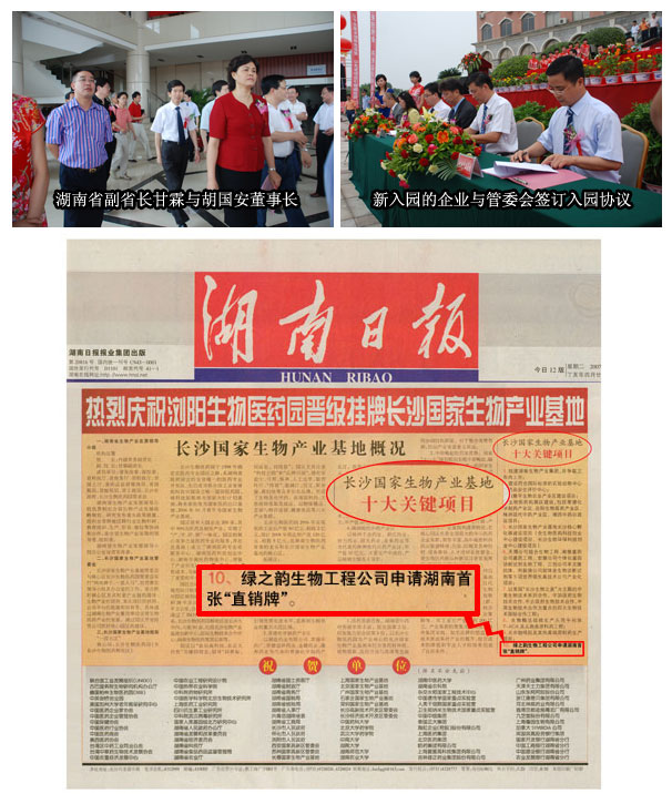 2007年6月12日上午九點(diǎn),綠之韻集團(tuán)國(guó)內(nèi)事業(yè)總部所在地瀏陽生物醫(yī)藥園舉行了晉級(jí)長(zhǎng)沙國(guó)家生物產(chǎn)業(yè)基地授牌儀式。國(guó)家發(fā)改委副主任張曉強(qiáng)、湖南省人民政府常務(wù)副省長(zhǎng)肖捷、湖南省副省長(zhǎng)甘霖、長(zhǎng)沙市副市長(zhǎng)劉曉明等領(lǐng)導(dǎo)出席儀式并講話。綠之韻集團(tuán)董事長(zhǎng)兼總裁胡國(guó)安先生、董事常務(wù)副總經(jīng)理勞嘉女士作為園區(qū)重點(diǎn)企業(yè)代表也受邀出席了儀式。