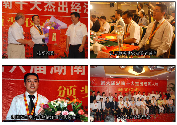 2007年5月23日,為期兩個月的第六屆湖南十大杰出經(jīng)濟(jì)人物評選結(jié)果終于塵埃落定,綠之韻集團(tuán)胡國安董事長被評為第六屆湖南十大杰出經(jīng)濟(jì)人物最具創(chuàng)新意識獎。此次活動通過大眾評選出了52名對湖南經(jīng)濟(jì)做出杰出貢獻(xiàn)的企業(yè)家為候選人。在考慮行業(yè)平衡、地區(qū)平衡和所有制平衡以及盡可能培育湖南新興經(jīng)濟(jì)力量等因素后,采取了資料審查、專家會審、對參評對象實地考察、網(wǎng)絡(luò)投票等方式,更直接、更全面、更廣泛地加深了對參評對象的了解,最后的獲獎?wù)叨际菍嵵撩麣w。