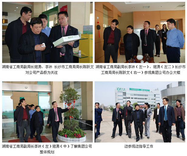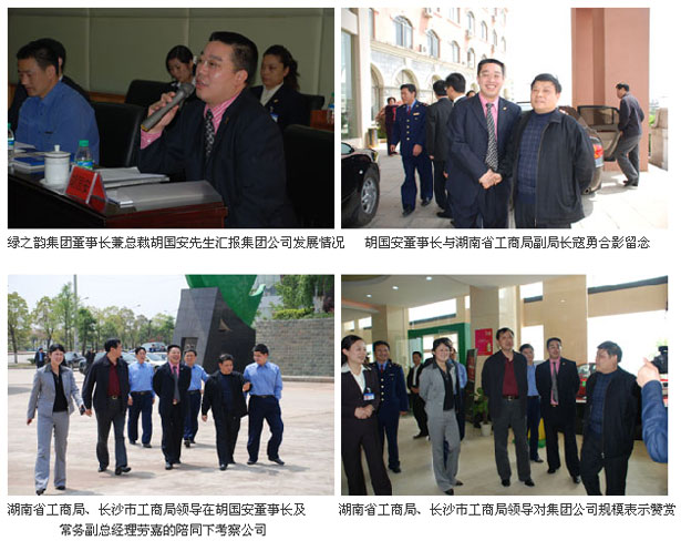 2007年4月11日,湖南省工商局副局長寇勇、李沐,長沙市工商局局長陳躍文等帶領(lǐng)省、市工商局市場處、外資處、商標廣告監(jiān)督管理處、注冊局等40余名領(lǐng)導(dǎo)深入湖南瀏陽生物醫(yī)藥園,對公司進行了調(diào)研考察。省、市工商局調(diào)研組一行首先在瀏陽生物醫(yī)藥園管委會政務(wù)廳聽取了瀏陽工商局、管委會領(lǐng)導(dǎo)以及綠之韻集團董事長兼總裁胡國安先生的工作匯報。