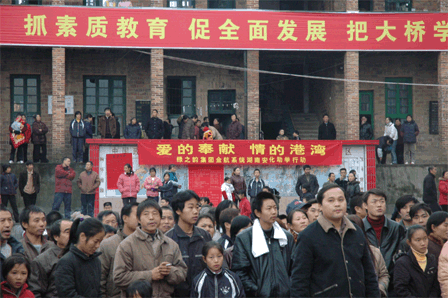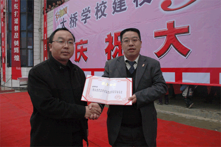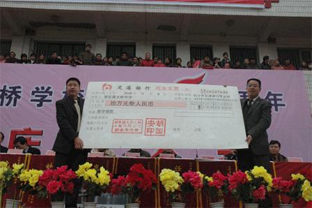 胡國(guó)安董事長(zhǎng)代表綠之韻集團(tuán)出資十萬元捐助了第四所綠之韻大橋希望中學(xué),這也是綠之韻集團(tuán)公司繼2006年5月28日在黑龍江省佳木斯市捐助了第三所綠之韻珠山希望小學(xué)后的又一次慈善義舉。本次捐贈(zèng)得到了當(dāng)?shù)馗咐相l(xiāng)親擁護(hù)的同時(shí)也得到湖南安化縣政府和教育局的高度贊譽(yù),并授予胡國(guó)安集董事長(zhǎng)為湖南安化冷市鎮(zhèn)大橋?qū)W?!皹s譽(yù)校長(zhǎng)”、安化縣“榮譽(yù)市民”的稱號(hào)。綠之韻優(yōu)秀經(jīng)銷商柳紅先、張吉福夫婦、李平、谷方彤、韓曉鳴以及綠之韻金航系統(tǒng)的部分代表作為綠之韻慈善基金會(huì)志愿者參加了此次活動(dòng)。曹鳳華、柳紅先、張吉福夫婦、李平、谷方彤、廉淇夫婦、王愛麗、浦守仁夫婦、韓曉鳴、呂艷玲等人慷慨解囊,為大橋中學(xué)捐款,紛紛被安化縣政府授予“榮譽(yù)市民”稱號(hào)和大橋?qū)W?!皭坌氖拐摺钡姆Q號(hào)。