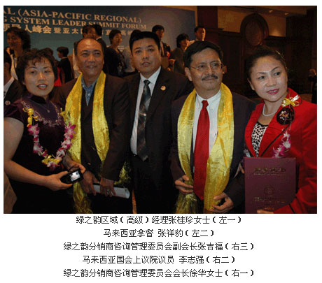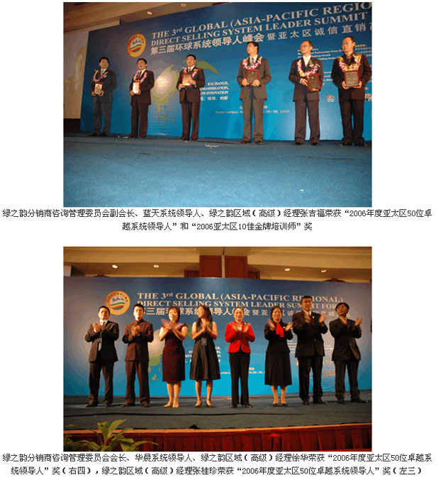 這次峰會,綠之韻公司捷報頻傳,綠之韻集團(tuán)分銷商(咨詢)管理委員會會長、綠之韻華晨系統(tǒng)領(lǐng)導(dǎo)人徐華、綠之韻集團(tuán)分銷商(咨詢)管理委員會副會長、綠之韻藍(lán)天系統(tǒng)領(lǐng)導(dǎo)人張吉福、綠之韻集團(tuán)分銷商(咨詢)管理委員會執(zhí)行秘書長劉國立、綠之韻區(qū)域(高級)經(jīng)理張桂珍同時榮獲“2006亞太區(qū)50位卓越系統(tǒng)領(lǐng)導(dǎo)人”稱號。同時“2006亞太區(qū)十佳金牌培訓(xùn)講師”這一榮譽(yù)稱號也被綠之韻藍(lán)天系統(tǒng)領(lǐng)導(dǎo)人張吉福獲得。這些來自頂級專業(yè)峰會的權(quán)威獎勵為綠之韻走向更好更快的走向國際奠定了基礎(chǔ)。