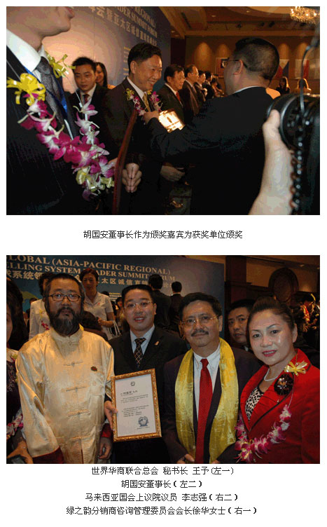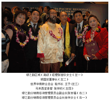 此次風(fēng)云聚會,綠之韻集團(tuán)憑借其三年多來在業(yè)界的出色表現(xiàn)及在直銷法規(guī)框架內(nèi)銳意創(chuàng)新的特色營銷模式,榮獲第三屆環(huán)球系統(tǒng)領(lǐng)導(dǎo)人峰會暨亞太區(qū)誠信高峰論壇“2006亞太區(qū)10佳創(chuàng)新營銷模式范例企業(yè)”大獎。集團(tuán)公司董事長兼總裁胡國安先生不但作為此次峰會的特約嘉賓為獲得“2006亞太區(qū)最具品牌競爭力十佳保健品”稱號的代表頒獎,更因其在推動和諧社會健康發(fā)展系列事業(yè)及活動中的卓越表現(xiàn),被世界和諧促進(jìn)會授予“世界和諧文化使者稱號”稱號。在獲獎感言中胡國安董事長表示:推動和諧社會發(fā)展是綠之韻公司永遠(yuǎn)的事業(yè),“共祈世界和諧進(jìn)步,同助人類健康幸?!币矊⑹蔷G之韻公司的永恒追求,不但是自己,所有綠之韻精英都將會為“實現(xiàn)人類同一愿望——共鑄和諧社會,共同承載人類同一責(zé)任——同創(chuàng)世界和平”事業(yè)繼續(xù)努力。