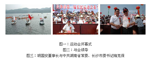 仲秋喜盼豐收日,盛世歡慶國(guó)慶時(shí)。2006年9月22日上午,由長(zhǎng)沙市市委、長(zhǎng)沙市人民政府主辦,綠之韻公司出資協(xié)辦的“長(zhǎng)沙市第一屆農(nóng)民運(yùn)動(dòng)會(huì)龍舟賽”在風(fēng)光秀美的瀏陽赤馬湖隆重開幕。湖南省常委、長(zhǎng)沙市委書記梅克保、長(zhǎng)沙市委巡視員、市人大黨組第一副書記余合泉、長(zhǎng)沙市市委副書記吳志雄、長(zhǎng)沙市市委秘書長(zhǎng)張湘濤、長(zhǎng)沙市人大副主任劉耀杰、長(zhǎng)沙市人民政府副市長(zhǎng)曹亞、長(zhǎng)沙市政協(xié)副主席柳冠群、市政協(xié)副主席姚五零、瀏陽市委書記易佳良、綠之韻集團(tuán)董事長(zhǎng)兼總裁胡國(guó)安先生與省市領(lǐng)導(dǎo)共同出席了第一屆農(nóng)民運(yùn)動(dòng)會(huì)開幕式。