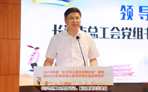 活動(dòng)伊始,長沙市總工會(huì)黨組書記、副主席周宏兆致辭。他首先代表長沙市總工會(huì)向各位領(lǐng)導(dǎo)、來賓的蒞臨表示歡迎,并向全市青少年兒童致以節(jié)日的問候。他表示,2019年,長沙市自然資源和規(guī)劃局、市教育局、市婦聯(lián)聯(lián)合出臺(tái)《長沙市創(chuàng)建“兒童友好型城市”三年行動(dòng)計(jì)劃(2018-2020年)》,圍繞政策友好、空間友好、服務(wù)友好三個(gè)方面,推出創(chuàng)建兒童友好型城市十大行動(dòng)、42項(xiàng)任務(wù),努力保障少年兒童在星城長沙健康快樂茁壯成長。這其中涌現(xiàn)出了一批長期致力于服務(wù)兒童、關(guān)心關(guān)愛職工子女,積極開展扶貧助學(xué)、保障兒童權(quán)利的企業(yè)。他向首批獲得“兒童友好型企業(yè)”稱號(hào)的企業(yè)代表們予以祝賀,希望獲獎(jiǎng)企業(yè)能繼續(xù)服務(wù)好職工子女,積極參與公益事業(yè),為長沙市兒童友好型城市建設(shè)貢獻(xiàn)出企業(yè)力量。