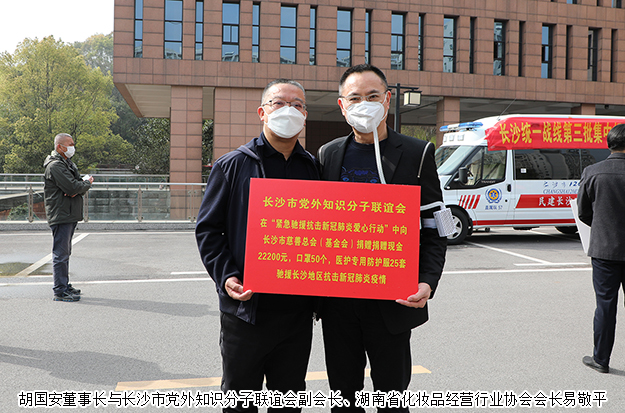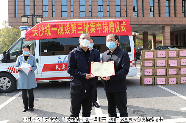 2020年3月18日,長沙市統(tǒng)一戰(zhàn)線第三批集中捐贈儀式在長沙市慈善基金會前坪舉行。中共長沙市委常委、市委統(tǒng)戰(zhàn)部部長譚小平,長沙市民政局黨組書記、局長、市慈善總會副會長陳昌佳,中共長沙市委統(tǒng)戰(zhàn)部常務(wù)副部長劉映群,中共長沙市委統(tǒng)戰(zhàn)部副部長、長沙市僑聯(lián)黨組書記王國平等領(lǐng)導(dǎo)出席活動,市委統(tǒng)戰(zhàn)部、市民政局、市民宗局、市慈善總會有關(guān)負(fù)責(zé)同志,各民主黨派市委負(fù)責(zé)同志,市黨外知識分子聯(lián)誼會負(fù)責(zé)同志,市宗教界代表人士,市海外聯(lián)誼會、香港長沙聯(lián)誼會代表人士參加活動。湖南省政協(xié)委員、長沙市海外聯(lián)誼會副會長、綠之韻集團(tuán)董事長胡國安受邀參加活動。