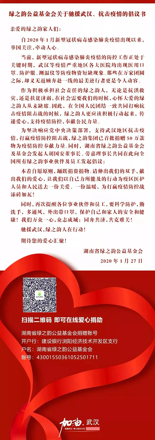 ▲1月29日,綠之韻碧波庭事業(yè)伙伴通過上海慈善基金會向湖北武漢等疫情嚴重的地方捐贈30萬元。1月30日,通過湖南省綠之韻公益基金會追加10萬元捐款。