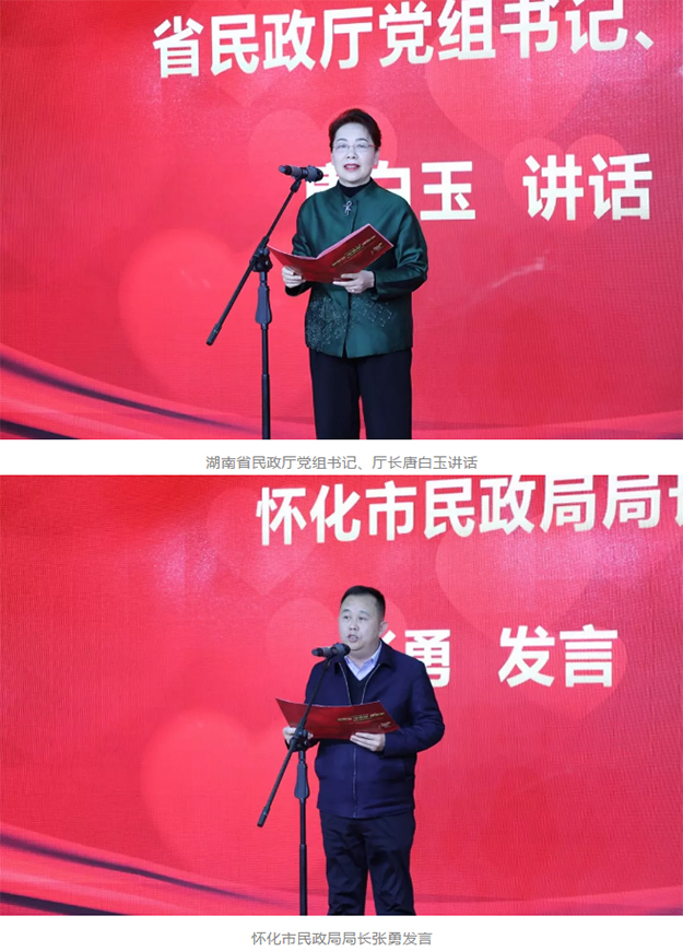 隨后,湖南省民政廳黨組書記、廳長唐白玉講話。她首先代表省民政廳向慷慨捐贈的愛心企業(yè)致以崇高的敬意,對長期以來關(guān)心支持民政事業(yè)、關(guān)心愛護困難群眾的社會愛心人士表示衷心的感謝。她表示,一直以來,省委省政府高度關(guān)注困難群眾、受災(zāi)群眾。此次“迎新春送溫暖獻愛心”活動共籌措資金3.3億元,預(yù)計慰問偏遠地區(qū)100萬貧困戶,確保困難群眾、受災(zāi)群眾基本生活得到保障。“迎新春送溫暖獻愛心”慰問活動承載著黨和政府的關(guān)懷,希望全省民政部門把開展好這項活動當成當前民生工作的首要任務(wù)來抓,公平公正公開地發(fā)放好救災(zāi)款物,把黨的“惠民、利民”工作送到每家每戶。她呼吁,希望社會各界共同行動,伸出援助之手、奉獻點滴愛心,讓困難群眾感受大家庭的溫暖,共同為全省脫貧攻堅貢獻力量。