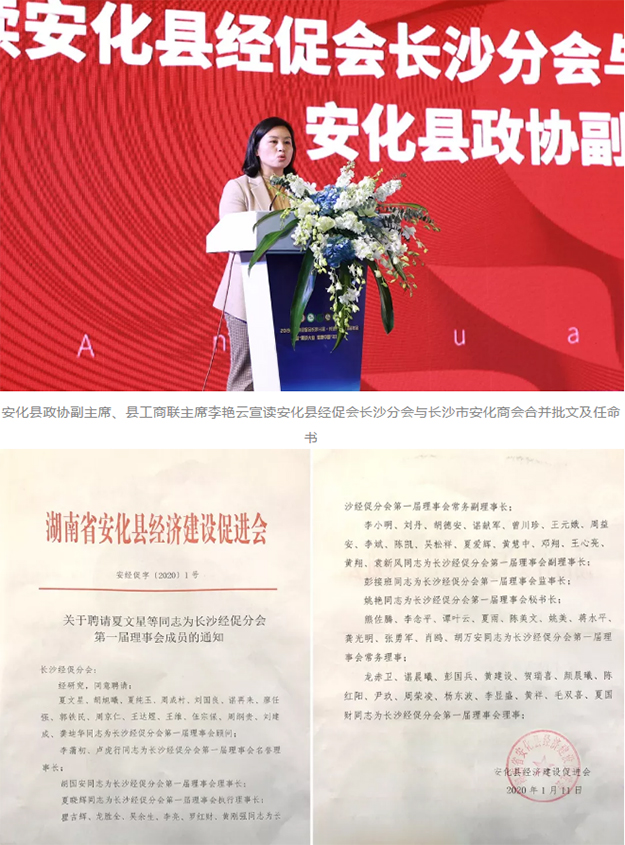 會(huì)上,長(zhǎng)沙市安化商會(huì)輪值會(huì)長(zhǎng)吳松祥作商會(huì)2019年度工作報(bào)告;長(zhǎng)沙市安化商會(huì)監(jiān)事長(zhǎng)彭接班作商會(huì)2019年度監(jiān)事報(bào)告;安化縣政協(xié)副主席、縣工商聯(lián)主席李艷云宣讀安化縣經(jīng)促會(huì)長(zhǎng)沙分會(huì)與長(zhǎng)沙市安化商會(huì)合并批文及任命書(shū)。其中,夏文星、胡旭曦等15名同志當(dāng)選為安化縣經(jīng)促會(huì)長(zhǎng)沙分會(huì)第一屆理事會(huì)顧問(wèn);李蒲初、盧虎行同志當(dāng)選為安化縣經(jīng)促會(huì)長(zhǎng)沙分會(huì)第一屆理事會(huì)名譽(yù)理事長(zhǎng);胡國(guó)安董事長(zhǎng)當(dāng)選安化縣經(jīng)促會(huì)長(zhǎng)沙分會(huì)第一屆理事會(huì)理事長(zhǎng)。