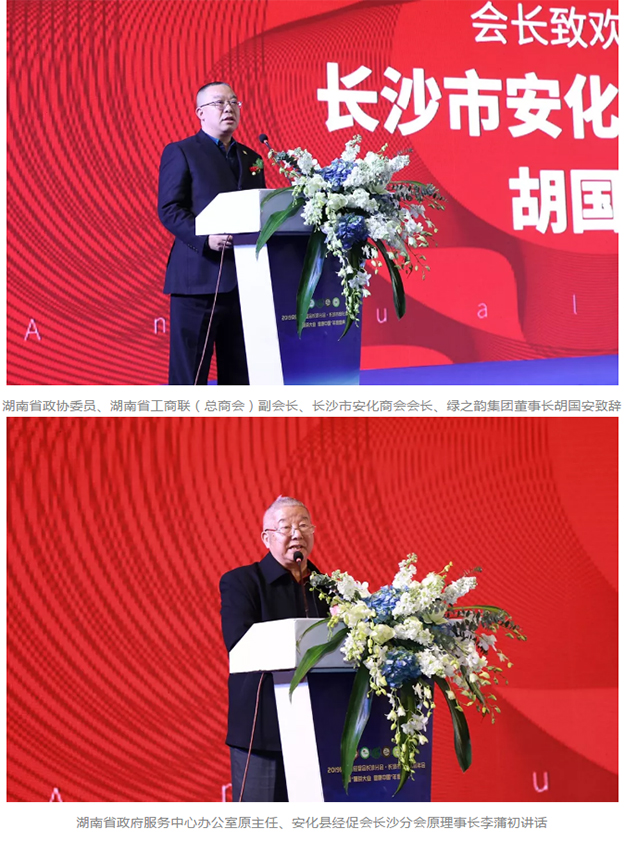 會(huì)議伊始,湖南省政協(xié)委員、湖南省工商聯(lián)(總商會(huì))副會(huì)長(zhǎng)、長(zhǎng)沙市安化商會(huì)會(huì)長(zhǎng)、綠之韻集團(tuán)董事長(zhǎng)胡國(guó)安致辭。胡國(guó)安會(huì)長(zhǎng)感謝給予商會(huì)各項(xiàng)工作關(guān)心和支持的各位領(lǐng)導(dǎo)及各兄弟商會(huì),總結(jié)2019年商會(huì)發(fā)展成果,并對(duì)2020年工作進(jìn)行部署。他希望,2020年,安化商會(huì)要繼續(xù)強(qiáng)化“平臺(tái)”和“橋梁”作用,內(nèi)外挖潛,擴(kuò)容拓新,發(fā)揮優(yōu)勢(shì),提升服務(wù),使商會(huì)真正成為團(tuán)結(jié)之家、服務(wù)之家、溫暖之家,促進(jìn)安化籍企業(yè)家在長(zhǎng)沙健康發(fā)展,努力為家鄉(xiāng)安化經(jīng)濟(jì)社會(huì)建設(shè)不遺余力,努力爭(zhēng)創(chuàng)省內(nèi)一流商會(huì)。
