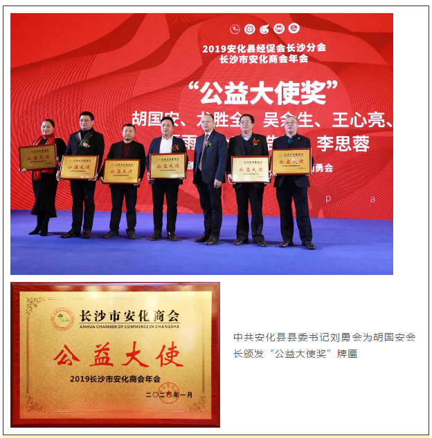 為了表彰為安化發(fā)展做出貢獻(xiàn)的會(huì)員代表,大會(huì)相繼頒發(fā)了“公益大使獎(jiǎng)”“優(yōu)秀會(huì)員獎(jiǎng)”“優(yōu)秀副會(huì)長(zhǎng)獎(jiǎng)”“特殊貢獻(xiàn)獎(jiǎng)”等獎(jiǎng)項(xiàng)。胡國(guó)安會(huì)長(zhǎng)積極投身社會(huì)公益事業(yè),組織會(huì)員參加“情系家鄉(xiāng)——安化商會(huì)回鄉(xiāng)商務(wù)考察活動(dòng)”;回報(bào)桑梓,踴躍參與家鄉(xiāng)扶貧濟(jì)困活動(dòng),給困難群眾送溫暖,為精準(zhǔn)扶貧工作貢獻(xiàn)力量。中共安化縣縣委書(shū)記劉勇會(huì)為胡國(guó)安會(huì)長(zhǎng)頒發(fā)“公益大使獎(jiǎng)”牌匾。