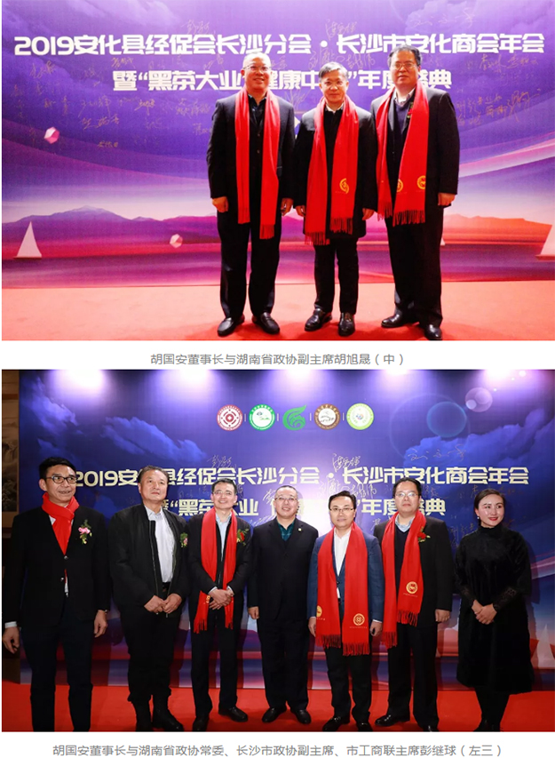 新年伊始,歲末迎春。2020年1月11日,2019安化縣經(jīng)促會(huì)長(zhǎng)沙分會(huì)、長(zhǎng)沙市安化商會(huì)年會(huì)暨“黑茶大業(yè) 健康中國(guó)”年度盛典在長(zhǎng)沙隆重舉行。本次大會(huì)得到各界領(lǐng)導(dǎo)和眾多企業(yè)的高度關(guān)注和支持,湖南省政協(xié)副主席胡旭晟,湖南省軍區(qū)原副司令員黃明開(kāi),湖南省公安廳原常務(wù)副廳長(zhǎng)胡旭曦,湖南省公安廳治安總隊(duì)政委夏曉鷗,湖南省民政廳副廳長(zhǎng)游勁民,湖南省工商聯(lián)副主席吳曙光,湖南省政協(xié)常委、長(zhǎng)沙市政協(xié)副主席、市工商聯(lián)主席彭繼球,長(zhǎng)沙市工商聯(lián)副主席、市商協(xié)會(huì)組織聯(lián)合黨委書(shū)記張明剛,中國(guó)工程院院士、湖南農(nóng)業(yè)大學(xué)教授、博士生導(dǎo)師劉仲華;益陽(yáng)市人民政府副市長(zhǎng)湯瑞祥,益陽(yáng)市人民政府副秘書(shū)長(zhǎng)匡維波;中共安化縣縣委書(shū)記劉勇會(huì),安化縣人民政府縣長(zhǎng)肖義,安化縣政協(xié)副主席、縣工商聯(lián)主席李艷云等領(lǐng)導(dǎo)嘉賓出席會(huì)議。湖南省政協(xié)委員、湖南省工商聯(lián)(總商會(huì))副會(huì)長(zhǎng)、長(zhǎng)沙市安化商會(huì)會(huì)長(zhǎng)、綠之韻集團(tuán)董事長(zhǎng)胡國(guó)安與長(zhǎng)沙市安化商會(huì)全體會(huì)員、安化各大商會(huì)代表、長(zhǎng)沙各行業(yè)安化籍知名企業(yè)和精英人士齊聚一堂,共迎未來(lái)發(fā)展新征程。