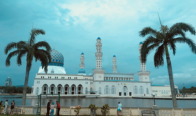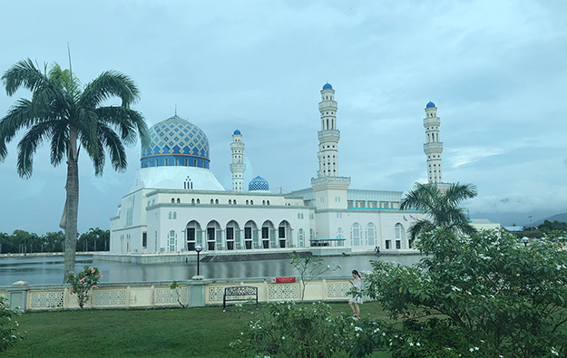 飛抵沙巴的第一天,用過豐富的早餐,家人們便來到了沙巴最著名的水上清真寺——哥達(dá)京那巴魯市立清真寺。它座落在里卡士灣畔(Likas Bay),是一座典型的當(dāng)代伊斯蘭教建筑,也是馬來西亞夕陽景觀最壯麗的清真寺之一。清真寺建于里卡士灣的人造湖上,清真寺的四座宣禮塔和美麗的穹頂非常引人注目,白色建筑倒映在湖水中,與蔚藍(lán)天色相襯,十分震撼。