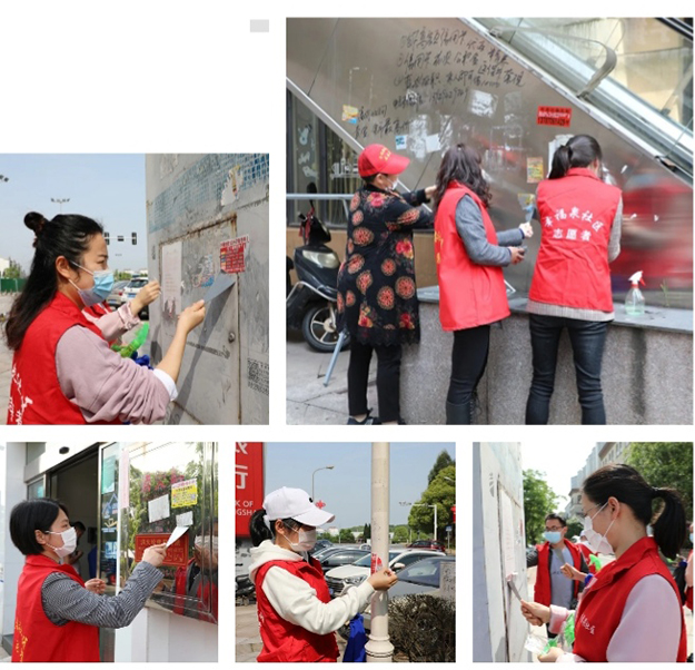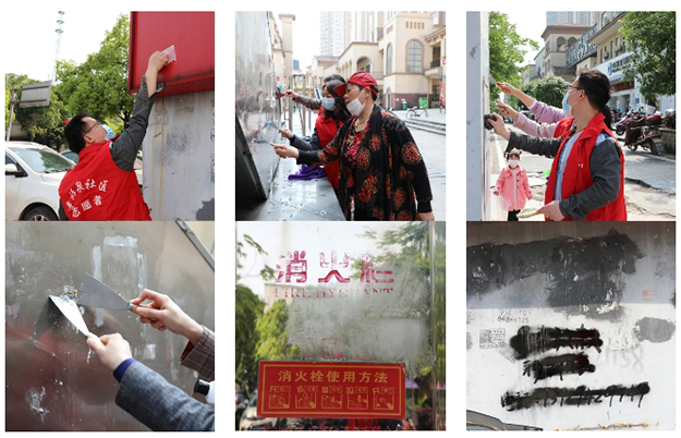 活動(dòng)現(xiàn)場(chǎng),綠之韻黨團(tuán)志愿者們穿著紅色馬甲,整裝待發(fā)。他們手里拿著抹布、鏟子、鋼絲球、清潔劑等工具,涌入幸福泉社區(qū)周邊街道的各個(gè)角落,清除著馬路邊、商鋪前的各類(lèi)牛皮癬。綠之韻黨團(tuán)志愿者還來(lái)到了仙人山農(nóng)貿(mào)市場(chǎng),對(duì)農(nóng)貿(mào)市場(chǎng)的商戶們進(jìn)行環(huán)境衛(wèi)生的相關(guān)宣傳,并將自己制作的衛(wèi)生防疫知識(shí)宣傳單分發(fā)到每一個(gè)商戶手中,用實(shí)際行動(dòng)踐行著“防疫有我,愛(ài)衛(wèi)同行”的主題精神。