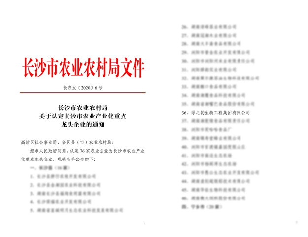 近日,長沙市農(nóng)業(yè)農(nóng)村局下發(fā)《關(guān)于認定長沙市農(nóng)業(yè)產(chǎn)業(yè)化重點龍頭企業(yè)的通知》,經(jīng)考察審核,報長沙市人民政府批準,綠之韻集團等76家企業(yè)被認定為“長沙市農(nóng)業(yè)產(chǎn)業(yè)化重點龍頭企業(yè)”。