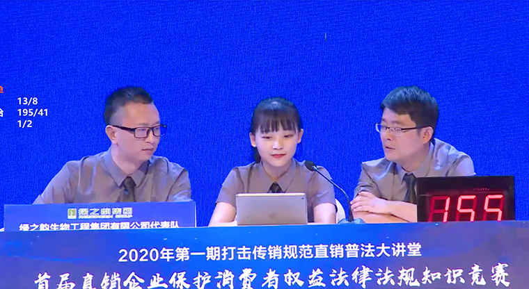 8月20日,根據(jù)國家市場監(jiān)督管理總局工作安排,由國家市場監(jiān)督管理總局規(guī)范直銷與打擊傳銷辦公室指導(dǎo)、中國消費(fèi)者報(bào)社承辦、重慶市市場監(jiān)督管理局協(xié)辦的2020年首期打傳規(guī)直普法大講堂宣傳活動(dòng)在重慶召開。綠之韻集團(tuán)受邀參加本次會(huì)議,并組建知識(shí)競賽代表隊(duì)參與“直銷企業(yè)保護(hù)消費(fèi)者權(quán)益法律法規(guī)知識(shí)競賽”環(huán)節(jié),與其他 8 家直銷企業(yè)代表隊(duì)同臺(tái)競技,展示行業(yè)整體積極風(fēng)貌。