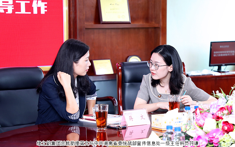 2020年9月16日,中共湖南省委統(tǒng)戰(zhàn)部宣傳信息處處長(zhǎng)李蓉、副處長(zhǎng)馮小明、一級(jí)主任科員符謙一行蒞臨綠之韻集團(tuán)調(diào)研指導(dǎo)。綠之韻集團(tuán)董事、總裁勞嘉,總裁助理蔣文陪同調(diào)研。