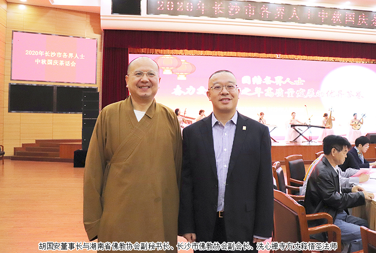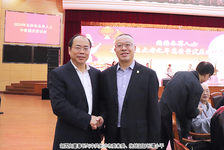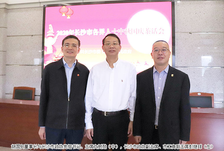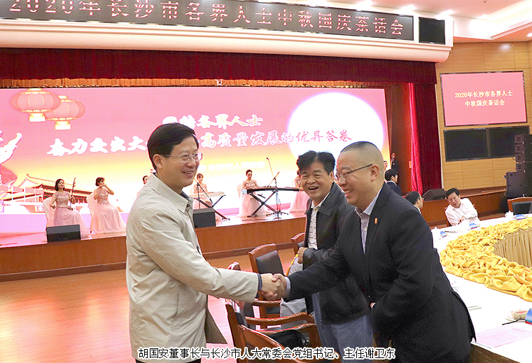 2020年9月28日,由中共長沙市委、長沙市政府主辦的2020年長沙市各界人士中秋國慶茶話會(huì)在長沙市會(huì)議中心召開。長沙市人大常委會(huì)黨組書記、主任謝衛(wèi)東,長沙市政協(xié)黨組書記、主席文樹勛,中共長沙市委常委、統(tǒng)戰(zhàn)部部長譚小平以及全市離退休老同志、各界人士共同出席活動(dòng)。湖南省政協(xié)委員、香港長沙聯(lián)誼會(huì)名譽(yù)會(huì)長、香港長沙商會(huì)常務(wù)副會(huì)長、綠之韻集團(tuán)董事長胡國安受邀出席活動(dòng),與參會(huì)嘉賓歡聚一堂,共敘友情、共謀發(fā)展,共慶中秋佳節(jié)和中華人民共和國成立71周年。