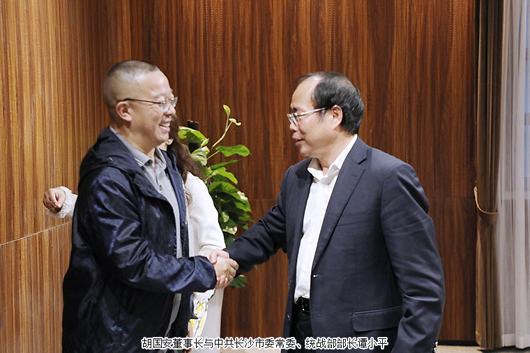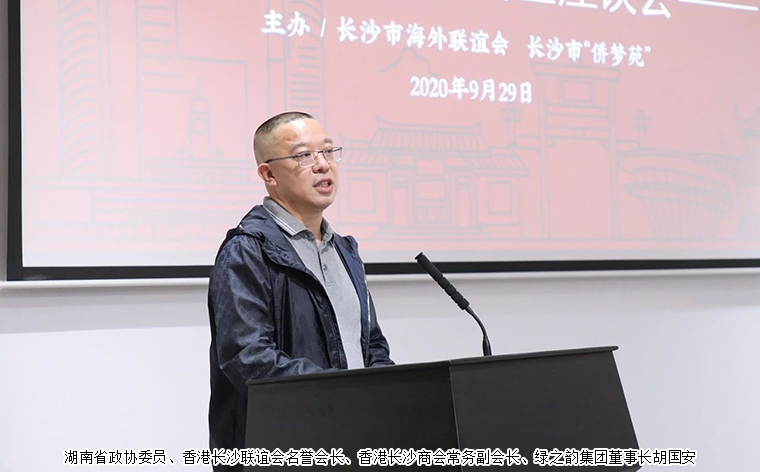 2020年9月29日,由長(zhǎng)沙市海外聯(lián)誼會(huì)、長(zhǎng)沙市“僑夢(mèng)苑”主辦的全市港澳僑企座談會(huì)在長(zhǎng)沙召開。中共長(zhǎng)沙市委常委、統(tǒng)戰(zhàn)部部長(zhǎng)譚小平,中共長(zhǎng)沙市委統(tǒng)戰(zhàn)部副部長(zhǎng)饒福明出席會(huì)議。湖南省政協(xié)委員、香港長(zhǎng)沙聯(lián)誼會(huì)名譽(yù)會(huì)長(zhǎng)、香港長(zhǎng)沙商會(huì)常務(wù)副會(huì)長(zhǎng)、綠之韻集團(tuán)董事長(zhǎng)胡國(guó)安受邀參加會(huì)議,與全市38家重點(diǎn)港澳僑企代表歡聚一堂、共敘情誼、共謀發(fā)展。
