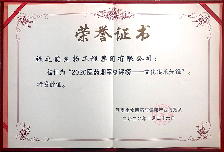 勞嘉總裁表示,此次獲評(píng)“2020醫(yī)藥湘軍總評(píng)榜文化傳承先鋒”,是社會(huì)各界對(duì)綠之韻十七年在中醫(yī)藥文化傳承中的表現(xiàn)予以肯定。自創(chuàng)立以來(lái),綠之韻始終秉持“運(yùn)用現(xiàn)代科技將中華五千年養(yǎng)生文化及中醫(yī)理論發(fā)揚(yáng)光大,為解決人類亞健康服務(wù)”的企業(yè)使命,堅(jiān)持“以產(chǎn)品為導(dǎo)向”,以綠色、天然、健康為核心,提出并倡導(dǎo)“清調(diào)補(bǔ)衡”的和諧養(yǎng)生新理念。積極響應(yīng)國(guó)家政策,助力生物醫(yī)藥和健康中國(guó)戰(zhàn)略,堅(jiān)持以研發(fā)具備核心競(jìng)爭(zhēng)力產(chǎn)品為發(fā)展方向,以產(chǎn)學(xué)研結(jié)合為模式先后與南京大學(xué)、湖南中醫(yī)藥研究院、湖南中醫(yī)藥大學(xué)、湖南農(nóng)業(yè)大學(xué)等科研院所、高等院校達(dá)成戰(zhàn)略合作。未來(lái),綠之韻將繼續(xù)響應(yīng)政府號(hào)召,繼續(xù)在生物醫(yī)藥、健康產(chǎn)業(yè)領(lǐng)域深耕細(xì)作,廣納人才和技術(shù)資源優(yōu)勢(shì),不斷提升企業(yè)綜合競(jìng)爭(zhēng)力,為湖南生物醫(yī)藥與健康產(chǎn)業(yè)邁上新臺(tái)階貢獻(xiàn)出自己的一份力量!