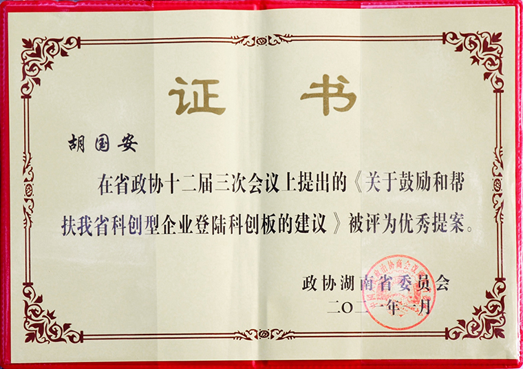 胡國(guó)安委員2020年提交的政協(xié)提案《關(guān)于鼓勵(lì)和幫扶我省科創(chuàng)型企業(yè)登陸科創(chuàng)板的建議》被政協(xié)湖南省委員會(huì)評(píng)為“優(yōu)秀提案”。作為一名三屆省政協(xié)“老委員”,胡國(guó)安委員廣泛傾聽社情民意、積極參與各種形式的調(diào)研活動(dòng),為省市實(shí)體經(jīng)濟(jì)發(fā)展獻(xiàn)計(jì)獻(xiàn)策。自履職以來(lái),他積極參政議政,共計(jì)提交了近40份有價(jià)值的政協(xié)提案,其中所提交的《關(guān)于加快我省電業(yè)園建設(shè)的建議》《關(guān)于推進(jìn)“互聯(lián)網(wǎng)+精準(zhǔn)扶貧”的建議》等提案,引起媒體廣泛關(guān)注。2010年,被省政協(xié)授予“優(yōu)秀政協(xié)委員”光榮稱號(hào),2016年《關(guān)于推進(jìn)“互聯(lián)網(wǎng)+精準(zhǔn)扶貧”的建議》提案榮獲省政協(xié)“優(yōu)秀提案”表彰。2018年,代表致公黨湖南省委提交的《關(guān)于主動(dòng)對(duì)接融入粵港澳大灣區(qū),加快推進(jìn)長(zhǎng)沙空鐵經(jīng)濟(jì)示范區(qū)的建議》提案,獲中共湖南省委書記許達(dá)哲重要批示。今年兩會(huì),胡國(guó)安委員向省政協(xié)提交了《依托中醫(yī)藥產(chǎn)業(yè),推進(jìn)我省中醫(yī)醫(yī)院治未病中心建設(shè)》和《關(guān)于進(jìn)一步推進(jìn)我省疾病預(yù)防控制事業(yè)發(fā)展的建議》兩份提案。