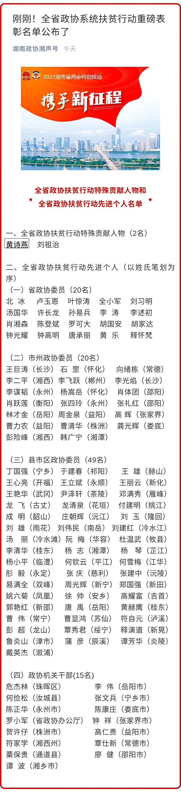 開幕會(huì)上,湖南省政協(xié)副主席賴明勇宣讀了全省政協(xié)扶貧行動(dòng)先進(jìn)個(gè)人表彰決定。據(jù)了解,自2016年以來(lái),全省各級(jí)政協(xié)組織和廣大政協(xié)委員積極參與省政協(xié)“助力脫貧攻堅(jiān)、全面建成小康社會(huì)”主題活動(dòng),參與“三個(gè)一”扶貧行動(dòng)和“湖南政協(xié)人助力鞏固脫貧成果萬(wàn)戶幫扶”行動(dòng),涌現(xiàn)出一大批深入群眾、無(wú)私奉獻(xiàn)、成效突出的扶貧先進(jìn)典型,為我省決戰(zhàn)決勝脫貧攻堅(jiān)、全面建成小康社會(huì)貢獻(xiàn)了政協(xié)智慧和力量。為表彰先進(jìn)、樹立典型、展示成效、激發(fā)動(dòng)力,經(jīng)全省各級(jí)政協(xié)組織推薦,全省政協(xié)扶貧行動(dòng)先進(jìn)個(gè)人評(píng)審領(lǐng)導(dǎo)小組評(píng)議,省政協(xié)主席會(huì)議審議通過,決定授予胡國(guó)安委員等20位省政協(xié)委員以及84位市縣政協(xié)委員、機(jī)關(guān)干部“全省政協(xié)扶貧行動(dòng)先進(jìn)個(gè)人”稱號(hào)。