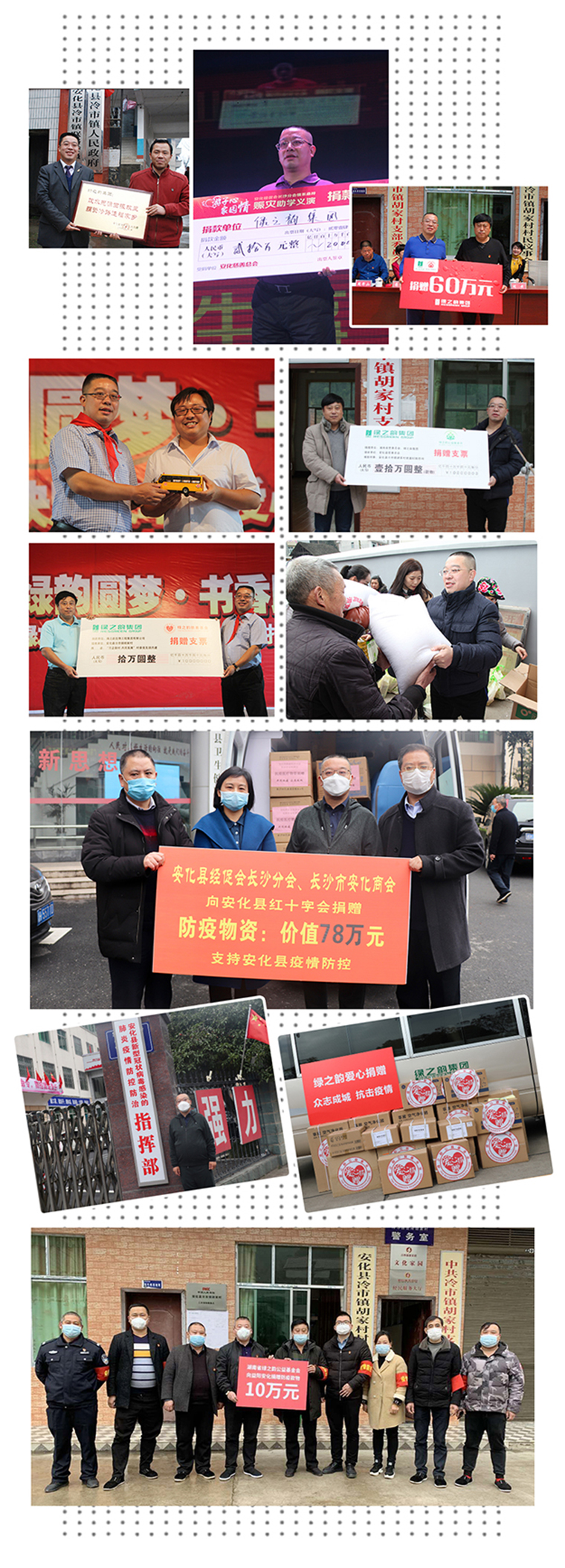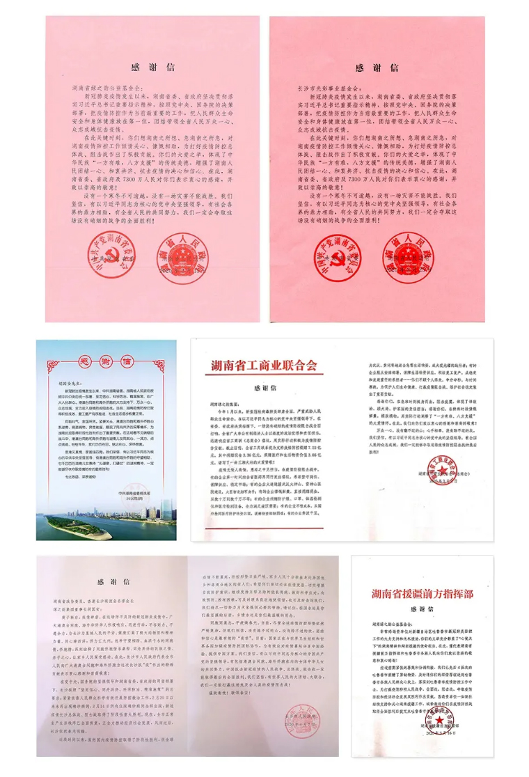 2020年初,抗擊新型冠狀病毒感染肺炎疫情攻堅(jiān)戰(zhàn)在全國(guó)打響。綠之韻公益基金會(huì)在胡國(guó)安委員的統(tǒng)一部署下,與企業(yè)黨委、工會(huì)、全國(guó)分公司、各下屬機(jī)構(gòu)上下聯(lián)動(dòng),通過多種方式積極援助湖北湖南抗擊疫情,累計(jì)捐贈(zèng)款物近200萬(wàn)元。綠之韻先后收到了湖南省委省政府、省委統(tǒng)戰(zhàn)部、致公黨湖南省委、省工商聯(lián)、省慈善總會(huì)、長(zhǎng)沙市委市政府、益陽(yáng)市委市政府、湘潭市委市政府發(fā)來(lái)的感謝信。近日,綠之韻被全國(guó)工商聯(lián)評(píng)為“抗擊新冠肺炎疫情先進(jìn)民營(yíng)企業(yè)”,湖南省綠之韻公益基金會(huì)被湖南省工商聯(lián)授予“抗擊新冠肺炎疫情先進(jìn)單位”光榮稱號(hào)。