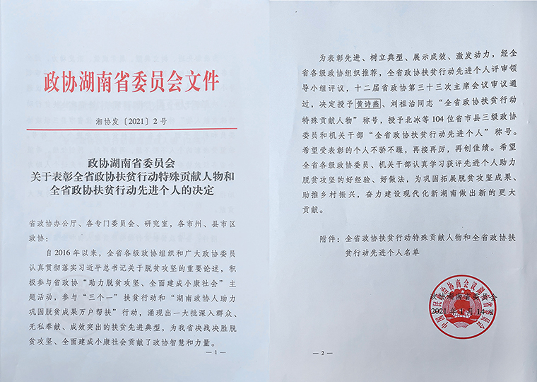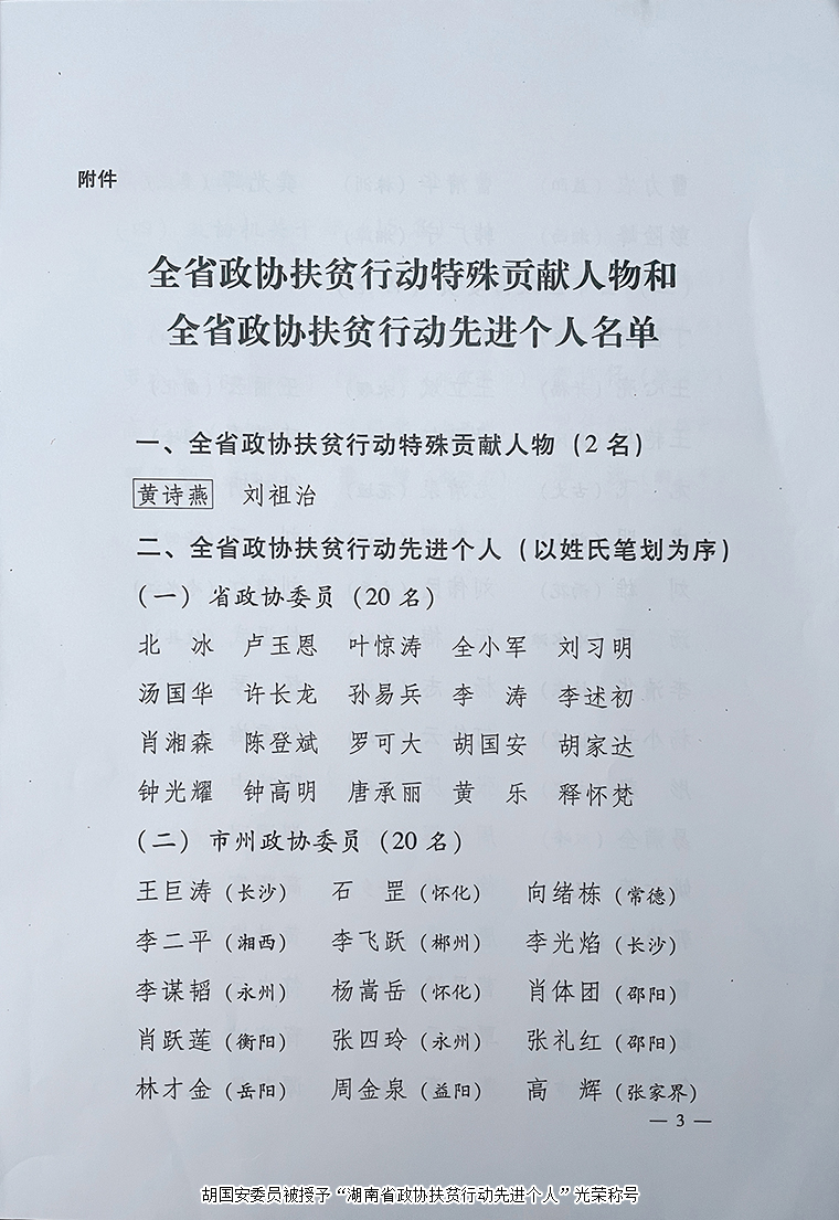 作為一名三屆省政協(xié)“老委員”,胡國安委員廣泛傾聽社情民意、積極參與各種形式的調(diào)研活動(dòng),為省市實(shí)體經(jīng)濟(jì)發(fā)展獻(xiàn)計(jì)獻(xiàn)策。自履職以來,他積極參政議政,共計(jì)提交了近40份有價(jià)值的政協(xié)提案,其中所提交的《關(guān)于加快我省電業(yè)園建設(shè)的建議》《關(guān)于推進(jìn)“互聯(lián)網(wǎng)+精準(zhǔn)扶貧”的建議》等提案,引起媒體廣泛關(guān)注。2010年,被省政協(xié)授予“優(yōu)秀政協(xié)委員”光榮稱號(hào),2016年《關(guān)于推進(jìn)“互聯(lián)網(wǎng)+精準(zhǔn)扶貧”的建議》提案榮獲省政協(xié)“優(yōu)秀提案”表彰。2018年,代表致公黨湖南省委提交的《關(guān)于主動(dòng)對(duì)接融入粵港澳大灣區(qū),加快推進(jìn)長沙空鐵經(jīng)濟(jì)示范區(qū)的建議》提案,獲中共湖南省委書記許達(dá)哲重要批示。