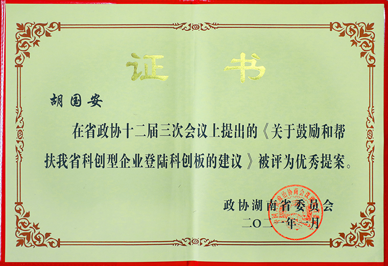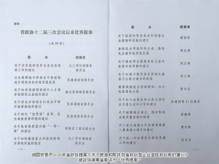 會(huì)議期間,胡國安委員廣泛同各界別委員們分別圍繞省委、省政府的中心工作,聚焦湖南改革發(fā)展大局和人民群眾普遍關(guān)心的重點(diǎn)問題,進(jìn)行深入探討和交流。此次會(huì)議,胡國安委員向省政協(xié)提交了《依托中醫(yī)藥產(chǎn)業(yè),推進(jìn)我省中醫(yī)醫(yī)院治未病中心建設(shè)》和《關(guān)于進(jìn)一步推進(jìn)我省疾病預(yù)防控制事業(yè)發(fā)展的建議》兩份提案?!蛾P(guān)于進(jìn)一步推進(jìn)我省疾病預(yù)防控制事業(yè)發(fā)展的建議》提案建議我省探索和建立基本公共衛(wèi)生服務(wù)項(xiàng)目、分級(jí)診療、家庭醫(yī)生簽約服務(wù)與慢性病預(yù)防控制相融合的創(chuàng)新型疾病防控體系?!蛾P(guān)于依托中醫(yī)藥產(chǎn)業(yè)、推進(jìn)我省中醫(yī)醫(yī)院治未病中心建設(shè)的建議》提案建議在我省范圍內(nèi)大力推動(dòng)公眾急救普及和急救體系建設(shè)之外,牢固樹立防重于治的理念,加快各級(jí)中醫(yī)醫(yī)院治未病中心建設(shè)。胡國安委員2020年提交的政協(xié)提案《關(guān)于鼓勵(lì)和幫扶我省科創(chuàng)型企業(yè)登陸科創(chuàng)板的建議》內(nèi)容緊扣當(dāng)前焦點(diǎn)熱點(diǎn)話題,受到與會(huì)委員的廣泛認(rèn)同,被政協(xié)湖南省委員會(huì)評(píng)為“優(yōu)秀提案”,引發(fā)多家新聞媒體聚焦報(bào)道。人民網(wǎng)、中國經(jīng)濟(jì)網(wǎng)、湖南衛(wèi)視、湖南經(jīng)視、搜狐網(wǎng)、鳳凰網(wǎng)、騰訊網(wǎng)、網(wǎng)易、今日頭條、紅網(wǎng)、時(shí)刻新聞、力量湖南、星辰在線、湘聲網(wǎng)等多家媒體先后對(duì)胡國安委員或提案進(jìn)行了新聞報(bào)道。