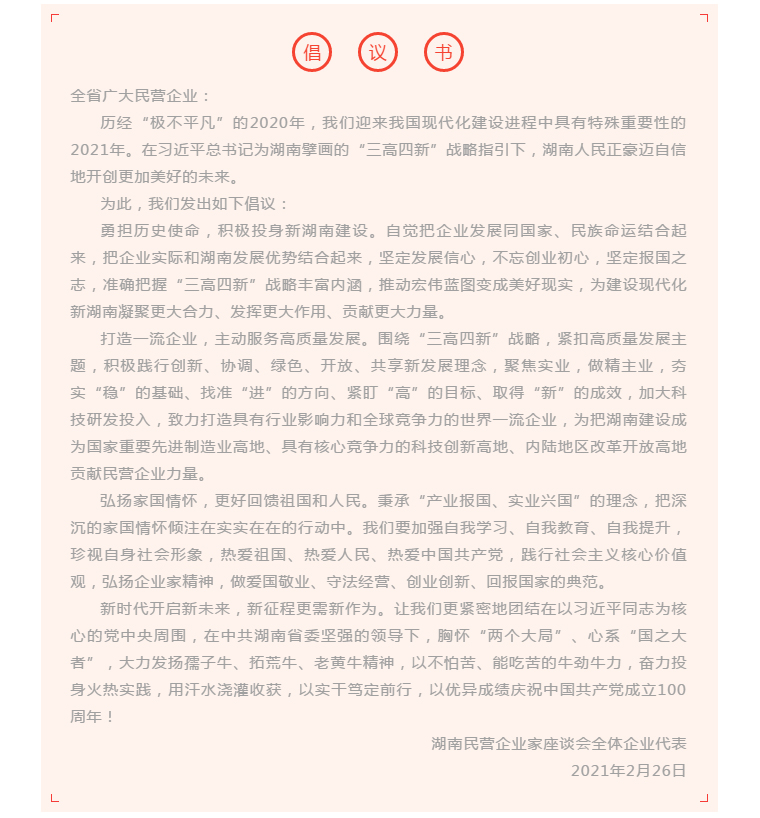 新時代開啟新未來,新征程更需新作為。2021年2月26日,在正月十五元宵節(jié)到來之際,湖南省政府召開民營企業(yè)家座談會。中共湖南省委副書記、省長毛偉明,省委常委、統(tǒng)戰(zhàn)部部長黃蘭香,省委常委、常務(wù)副省長謝建輝,湖南省政協(xié)副主席、省工商聯(lián)主席張健等領(lǐng)導(dǎo)以及有關(guān)省直和中央駐長單位負責(zé)人出席會議。三一集團董事長梁穩(wěn)根、藍思科技董事長周群飛、山河智能董事長何清華、鹽津鋪子董事長張學(xué)武、綠之韻集團董事長胡國安等40位湖南知名民營企業(yè)家受邀參加座談會。